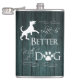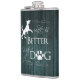 A perfect flask for those who find life much better with a dog in it. This flask design features text that says "Life is better with a Dog." with a paw print and dog silhouette embellishment against a deep teal wooden background. Additional gift items available with this design as well.