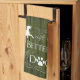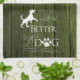 The perfect kitchen towel for those who find life much better with a dog in it. The Life is better with a Dog Kitchen Towel features text that says "Life is better with a Dog." with a paw print and dog silhouette embellishment against a deep green wooden background. Additional gift items available with this design as well.