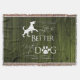 The perfect throw blanket for those who find life much better with a dog in it. The Life is better with a Dog Throw Blanket features text that says "Life is better with a Dog." with a paw print and dog silhouette embellishment against a deep green rustic wooden background. Additional gift items available with this design as well.
