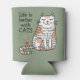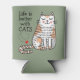 Cute funny doodle of a cat sitting up with her eyes closed, pink cheeks and tan patches. To her left are the words life is better with cats in a fun black font. A small red love heart is buzzing its way down from the the letter C and the background is a green colour.