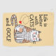 Cute funny doodle of a cat sitting up with her eyes closed, pink cheeks and tan patches. To her left are the words life is better with cats and golf in a fun black font. A small red love heart is buzzing its way down from the the letter C and the background is a beige colour.