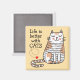 Cute funny doodle of a cat sitting up with her eyes closed, pink cheeks and tan patches. To her left are the words life is better with cats in a fun black font. A small red love heart is buzzing its way down from the the letter C and the background is a beige colour.