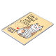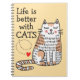 Cute funny doodle of a cat sitting up with her eyes closed, pink cheeks and tan patches. To her left are the words life is better with cats in a fun black font. A small red love heart is buzzing its way down from the the letter C and the background is a beige colour.