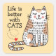 Cute funny doodle of a cat sitting up with her eyes closed, pink cheeks and tan patches. To her left are the words life is better with cats in a fun black font. A small red love heart is buzzing its way down from the the letter C and the background is a beige colour.