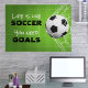 Motivational soccer-themed poster with the words "Life is like Soccer, you need GOALS." Poster shows a soccer goal with the ball in the next against a background of a soccer field. Personalize it by clicking on the CUSTOMIZE tab to add text. Contact the designer if you’d like this design on another product.