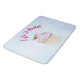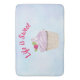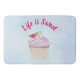 A bathmat with the text: Life is Sweet. Designed with an illustration of a delicious cupcake with pink swirls and a berry with leaves nestled in the frosting. Set on a light blue pastel watercolor background.