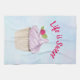 A kitchen towel with the saying: Life is Sweet. Designed with an illustration of a delicious cupcake with pink swirls and a berry with leaves nestled in the frosting. Set on a light blue pastel watercolor background.