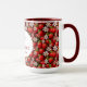 A pretty background of different juicy red strawberries, with a centre element in white with a tiny red outline.