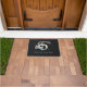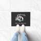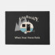 Campier doormat with inspirational slogan "Life Rocks When Your Home Rolls", which can be edited to your own words. Printed on a black background scene of a vintage canned ham style travel trailer in blue and cream under the moon and stars. See more in this collection at Camp_and_Cottage on Zazzle.