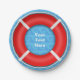 Red life preserver design on blue curley wave background to personalise for fun custom nautical themed party products.
