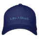 Hat shown in blue with blue embroidered text: lifes A Beach. Customise this hat or buy as is.