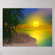 A warm tropical island 3d scene with a beach, palm trees and setting sun.