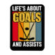 Hockey theme flexible magnet with hockey puck and sticks with colourful stripes and text that Life's About Goals and Assists!