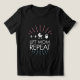 This T-shirt design is minimalist and retro gym-themed, set against a solid black background. It features subtle neon pink and blue accents and showcases three clean, iconic symbols—a barbell, a stroller, and a kettlebell—arranged in a harmonious repeating pattern. Below the icons, the phrase "Lift Mum Repeat" is elegantly displayed in a sleek, sans-serif font, capturing the balance of fitness and motherhood. Perfect for active moms who juggle workouts and parenting while staying motivated and stylish.