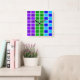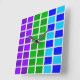 A photo of a colorful peacock’s feathers inspired this purple, blue and green squares wall clock.