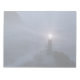 A lighthouse with a cross as the light shines out over the rocks and breakers of a mist-covered shore, showing incoming boats the way to safety.
