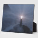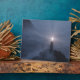 A lighthouse with a cross as the light shines out over the rocks and breakers of a mist-covered shore, showing incoming boats the way to safety.