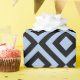 This bold light blue and black geometric pattern is an original ornamental design. Pale blue diamonds with black borders are surrounded by baby blue meanders which angle around them. Black zigzags separate the winding light blue paths and offset diamonds.