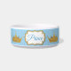 Pretty pet food / water dish done in white ceramic, with a sky blue band, around the bowl and graphics of gold tone crowns. A decorative gold and white plaque text area, on the front has blue text ready to personalise for your little prince in residence.