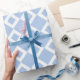 A cool geometric pattern of interlocking light blue and white diamond shapes. The white diamonds each contain a small baby blue diamond making pale blue the dominant colour of the original design.
