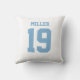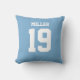 Add a name and number(s) to personalise this custom double-sided light blue and white sports jersey inspired accent pillow. It is an excellent gift for a sports fan or athlete. The options to change the colour and font sizes are available.