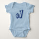 This light blue baby bodysuit features a prominent dark blue and white "#1" graphic on the chest, making it the perfect outfit for celebrating a little one's first birthday. The short-sleeved bodysuit is made from a soft, comfortable material that is suitable for babies.