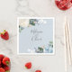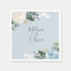 Elegant blue, white and blush watercolor flowers with soft green foliage on light powder blue background, personalised paper napkins.