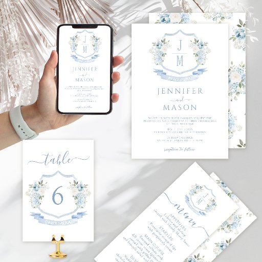 Immerse yourself in refined sophistication with this elegant Victorian French styled wedding invitation, featuring graceful illustrations of light blue and white flowers forming a wreaths on vintage crest with bride and groom mongram inside. A perfect choice to infuse charm into your spring or summer celebration, this invitation captures the essence of classic beauty.