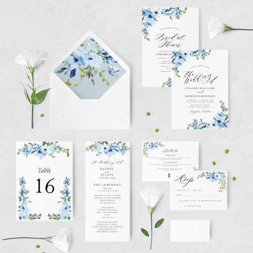 watercolor light blue floral with elegant black text. Personalise the text and colours on this wedding program template.