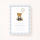 Featuring a sweet brown teddy holding a balloon and dressed in overalls, this adorable design sets the perfect tone for a cosy and heartfelt celebration. The soft blue gingham background adds a timeless, classic touch—perfect for baby showers or teddy bear-themed gatherings.
