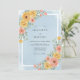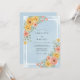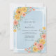 A serene light blue watercolor wash sets a tranquil tone for this cheerful seasonal design. Vibrant yellow roses and delicate peach ranunculus bloom in lush clusters alongside fresh eucalyptus greenery. This painterly floral aesthetic creates a bright and airy atmosphere for an outdoor ceremony. The warm pastel palette evokes a sense of romance and natural beauty.