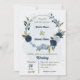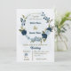Beautiful romantic wedding invitations featuring navy blue and light dusty blue flowers and some pretty leaves .