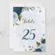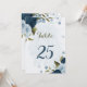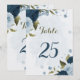 Beautiful romantic table number card featuring navy blue and light dusty blue flowers and some pretty leaves .