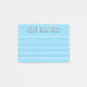 Lined post it notepad with your name at the top in big block letters white a white outline and black shadow. Lines in white and blue against a light sky blue background. Write down your notes and messages on this personalised blue sticky notepad with your name at the top.
