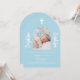 A light blue background, decorated with a white cross Personalise and add a photo name and details. White text. Arch shaped photo frame.