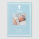 A light blue background, decorated with a white frame, and a white cross Personalise and add a photo name and details. White text.