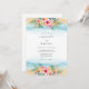 This watercolor design captures a serene coastal atmosphere with soft turquoise waves and sandy washes. Vibrant pink hibiscus and yellow plumeria flowers bloom alongside lush green monstera and palm foliage. The artistic palette evokes a warm, airy seaside destination feel, perfect for a romantic summer event by the ocean.