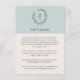 A tasteful and classic choice in wedding details enclosure cards, this design in light blue and ecru beige conveys a simple elegance in its text layout and classic style. A simple open laurel wreath of sketched leaves surrounds the monogram initial of the bride and groom. The elegant yet simple text template has a sample text template to personalise with your desired information. You can include hotel accommodations available to your guests, your wedding website, special events, transportation info or whatever details you wish to provide your guests. It is available in a variety of popular colours (shown here in the deep sage green and ecru) as well as many different paper types and weights.