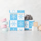 White and light blue snowflakes alternate on chequered bright blue and white squares to create a stylish geometric pattern perfect for the holidays.