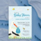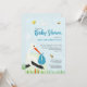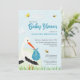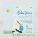 Cute customisable boy baby shower invitation template featuring a hand drawn stork with bees and butterfly on a meadow and sky blue background. Blue stork makes special delivery of a baby boy. Celebrate the impending arrival of the new baby boy with this cute stork baby sprinkle boy invitation card. Personalise the invitation with your text and info.
