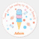 Light blue Whimsical Ice cream Party Sticker. Great for Candy buffets or cupcake tables at weddings, birthday parties, Baby showers, Communion, Confirmations and lots more! Design features a triple scoop Ice cream and cone with orange and blue gum-balls and wrapped candies floating about on a white background with an outer light blue circle. "Thanks for making my party so Sweet!". The child's name is placed beneath the the gum ball machine. You can change this text under the 'Customise' Menu. If you would like a custom designed sticker, click 'Contact' above and fill in your requirements. Design by firedropdesign.com