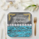 An elegant Surprise Birthday Paper Plate, with gold and silver. A light blue glitter Zebra print decorated with shiny diamonds.