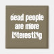 This simple humourous magnet has the text "Dead people are more interesting" in a creative brilliant white font on a neutral taupe (grey - ish brown or brownish grey) background. It is a funny idea for an archaeologist, an anthropologist, an ancient historian, a classic literature lover, or anyone whose job, studies or hobbies involve... well, you guessed it: dead people. Or maybe you could simply give it to that friend who loves books, TV series and movies but always falls in love with characters who are Doomed By Canon... in any case, it is a cute way to personalise your fridge! This colour scheme works well with a modern home décor or with a rustic country style.