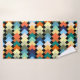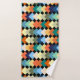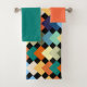 This towel set has an orange washcloth, a turquoise hand towel, and a bath towel with a geometric design of light-coloured diamonds overlapping each other on a field of black.