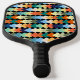 This pickleball paddle has a geometric design of light-coloured diamonds overlapping each other on a field of black.