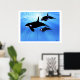 Two female and one male killer whales hunt together in the beautiful clear ocean.