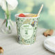 These hand-drawn St. Patrick's Day Luck & Joy Coins & Green Shamrocks pattern paper cups feature a playful mix of Irish imagery including clovers, shamrock gold coins, a pot of gold at the end of a rainbow, a leprechaun hat and the heartwarming message, "Wishing you endless luck and joy!" Light green background. Personalise with your family name and year.