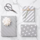 Soft shade of grey and white mix and match patterns in grey and white stripes, grey and white polka dots. Fun cohesive gift wrap supplies for birthdays, showers, parties, holidays, anniversaries and weddings.