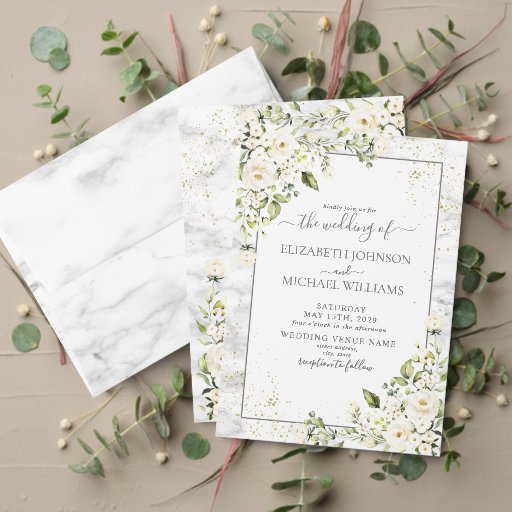Light Grey White Floral Gold Marble Photo Wedding Invitation
