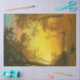 This design features a painting by Albert Bierstadt (1830–1902). It shows a beautiful landscape in the American West with a bright sunset flooding the scene with sunlight. There are some deer standing beside a pool of water in the forest.